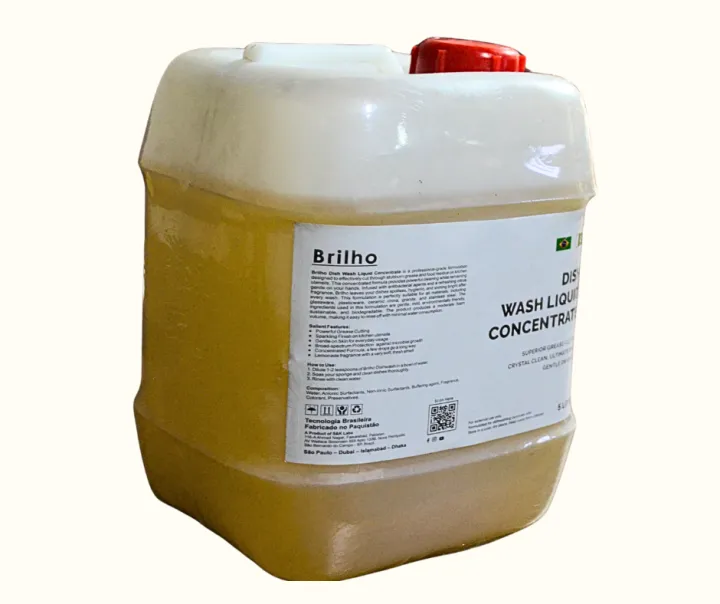 Brilho Dishwashing Liquid Concentrate is a professional-grade formulation designed to effectively cut through stubborn grease and food residue on kitchen utensils. This concentrated formula provides powerful cleaning while remaining gentle on your hands. Infused with antibacterial agents and a refreshing citrus fragrance, Brilho leaves your dishes spotless, hygienic, and shining bright after every wash. This formulation is perfectly suitable for all materials, including glassware, plasticware, ceramic china, granite, and stainless steel. The ingredients used in this formulation are gentle, mild, environmentally friendly, sustainable, and biodegradable. The product produces a moderate foam volume, making it easy to rinse off with minimal water consumption.